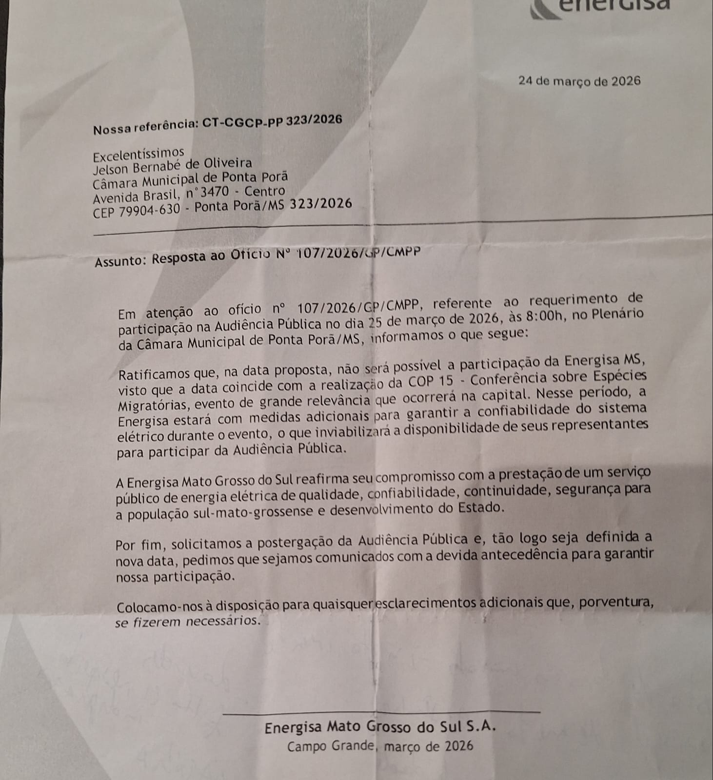 Logo após a abertura regimental da audiência pública quanto à prestação de serviços por parte da Energisa, feita pelo vereador Jelson Bernabé, os vereadores presentes a sessão Lourdes Monteiro, Natália Velasques, Agnaldo Pereira Lima, Gabriel Arce, Edinho Quintana, Valderlei Avelino e Carlos Bordão fizeram uso da palavra e demonstraram a revolta e o descontentamento quanto a não presença de um representante da empresa nesta audiência que havia sido marcado há algum tempo. Em oficio enviado, a empresa Energisa justifica a ausência, afirmando a data coincide com a realização da COP 15 na capital e que nesse período a empresa estaria com medidas para garantir a energia elétrica no evento, mas que reafirma o seu COMPROMISSO com a prestação de serviço público de energia elétrica com qualidade.